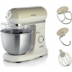Die Küchenmaschine hat eine große Metallschüssel mit einem Fassungsvermögen von 5,5 Litern. Sie ist mit einem Spritzschutz mit spezieller Öffnung zum Einfüllen von Zutaten und starken Saugnäpfen ausgestattet, die das Gerät während des Betriebs vor Bewegungen auf der Arbeitsfläche schützen. Mit dem speziellen Knethaken zum Kneten von dickem Teig und der hohen Motorleistung können Sie Hefe-, Brot- und Pizzateig ganz mühelos zubereiten.
