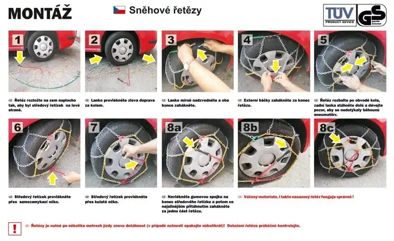 Versuchen Sie, vor Ihrer ersten Fahrt Schneeketten zu montieren. Schneeketten sollten nur dann verwendet werden, wenn dies unbedingt erforderlich ist, um das Fahrverhalten des Fahrzeugs bei Schnee oder Glätte zu verbessern. Bei der Verwendung von Schneeketten sollte auf ungewöhnliche Fahrreaktionen geachtet werden. Plötzliches Bremsen oder Beschleunigen wird nicht empfohlen. Die Höchstgeschwindigkeit bei Verwendung von Schneeketten beträgt 50 km/h. Der Teil der Kette, der mit dem Boden in Berührung kommt, unterliegt einem gewissen Verschleiß. Eine Kette, die zu mehr als 30 % verschlissen ist, darf nicht verwendet werden! Wenn die Kette reißt, muss sie sofort vom Fahrzeug entfernt werden, um Schäden am Fahrzeug zu vermeiden. Waschen Sie die Kette nach Gebrauch mit warmem (kochendem) Wasser und lassen Sie sie trocknen. Bewahren Sie die Ketten in einer Kunststoffbox auf. Schneeketten haben eine Garantie gegen Herstellungsfehler. Von der Garantie ausgeschlossen sind: Überschreitung der empfohlenen Geschwindigkeit von 50 km/h, unsachgemäße Montage, Verwendung auf unzureichender Schneeoberfläche. Garantiereparaturen werden ausschließlich durch den Austausch von beschädigten Teilen durchgeführt. Wir haften in keinem Fall für Schäden, die durch die Verwendung von Ketten verursacht werden. Die Schneeketten am Fahrrad dürfen keinen Spielraum aufweisen. Insbesondere bei Fahrzeugen mit niedrigem Fahrwerk (Sportumbau, tiefergelegte Federn und Stoßdämpfer, Niederquerschnittsreifen usw.) ist auf einen ausreichenden Abstand zwischen Rad und Radkasten zu achten. Bei solchen Fahrzeugen besteht die Gefahr, dass die Radkästen durch lose Kettenteile beschädigt werden - die Ketten müssen während der Fahrt besonders sorgfältig kontrolliert und regelmäßig nachgespannt werden. Wenden Sie sich im Zweifelsfall immer zuerst an Ihren Händler.