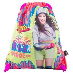 Blauer Schuhbeutel mit auffälligen rosa Schnürsenkeln zum Tragen auf dem Rücken.