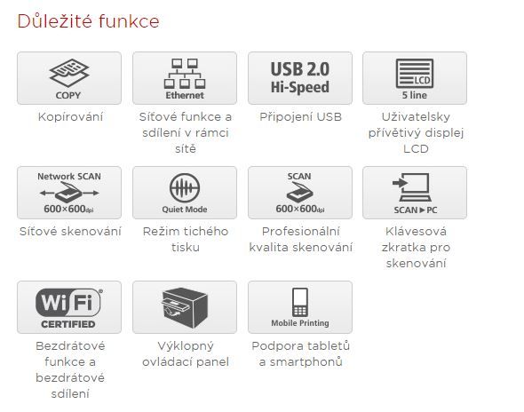 - Černobílé laserové zařízení 3 v 1 s vestavěným síťovým rozhraním, rozhraním Wi-Fi a možností připojení k mobilním zařízením: tisk, kopírování a skenování