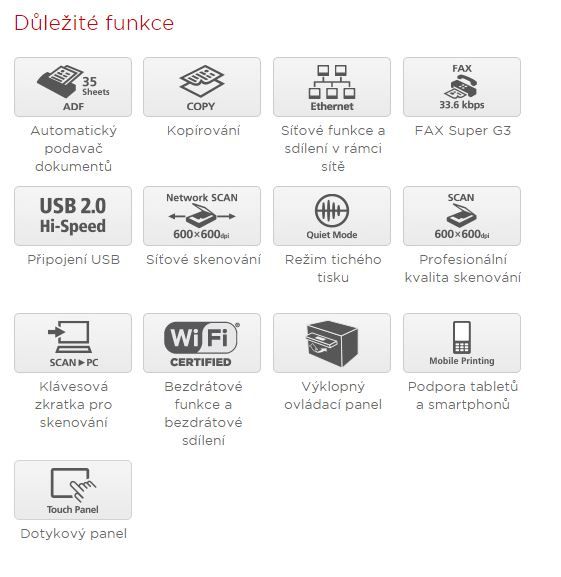 - Černobílé laserové multifunkční zařízení s vestavěným síťovým rozhraním, rozhraním Wi-Fi a možností připojení k mobilním zařízením
