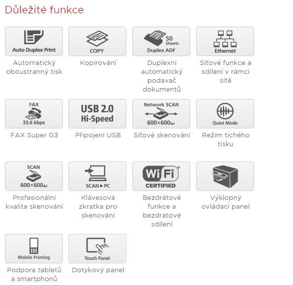 - Černobílé laserové multifunkční zařízení s vestavěným síťovým rozhraním, rozhraním Wi-Fi a možností připojení k mobilním zařízením