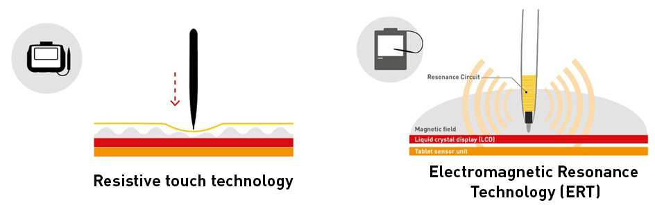 Evolis-Pads arbeiten mit resistiver Technologie (Unterschrift wird mit Stift oder Finger erfasst) oder ERT-Technologie (Pad reagiert nur auf den Stift).