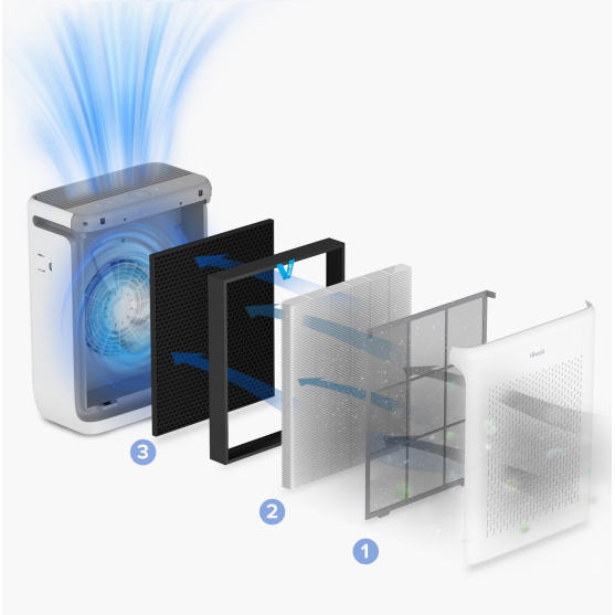 Die zweite Stufe ist der H13True HEPA-Filter mit HEPASmart™-Technologie. Angereichert mit statisch geladenen Fasern, die mindestens 99,99 % der 0,3 Mikrometer großen Luftpartikel wie Feinstaub, Rauchpartikel, Schimmel, Bakterien, Pollen, Rauchpartikel, Staubmilben und Tierhaare auffangen. Damit hebt sich Levoit von der Konkurrenz ab, denn der H13 HEPA-Filter ist wesentlich hochwertiger und zuverlässiger als die üblicherweise verwendeten Filter.