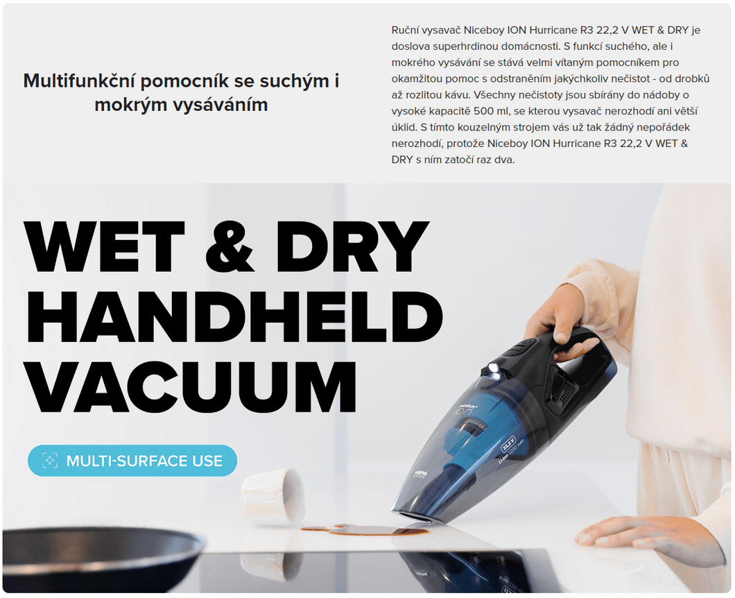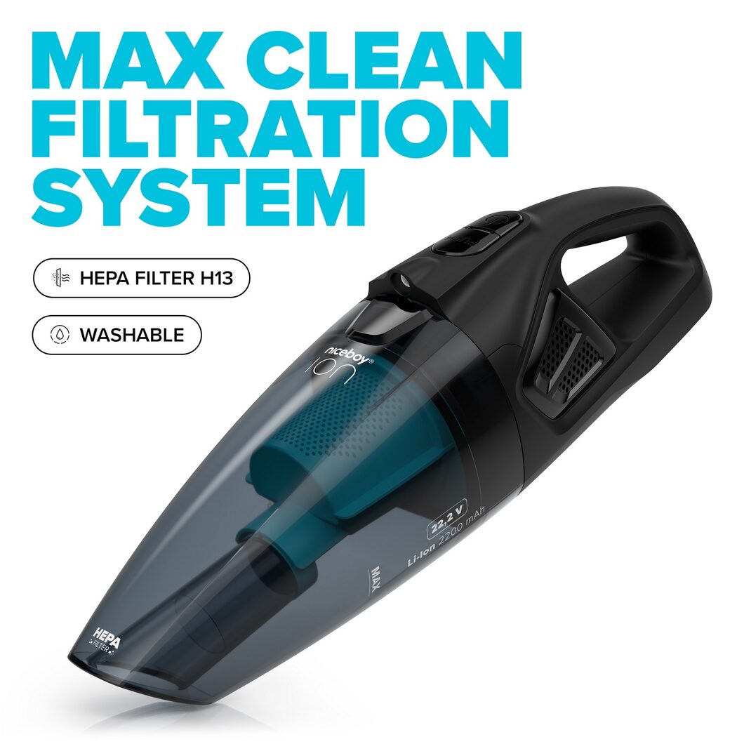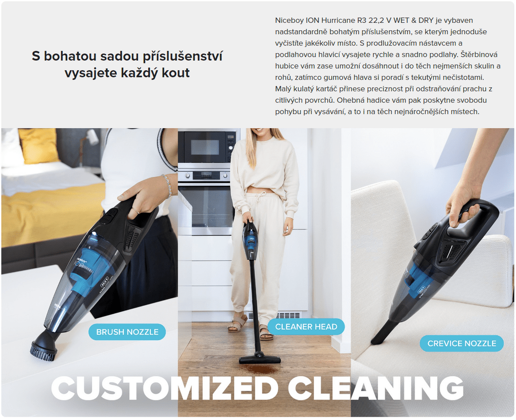 Niceboy ION Hurricane R3 22,2 V WET & DRY Handstaubsauger Ladestation, R&R, Clean & Clean, Clean & Clean, Gummikopf, Kleine Rundbürste, Flexibler Schlauch, Bodenaufsatz |