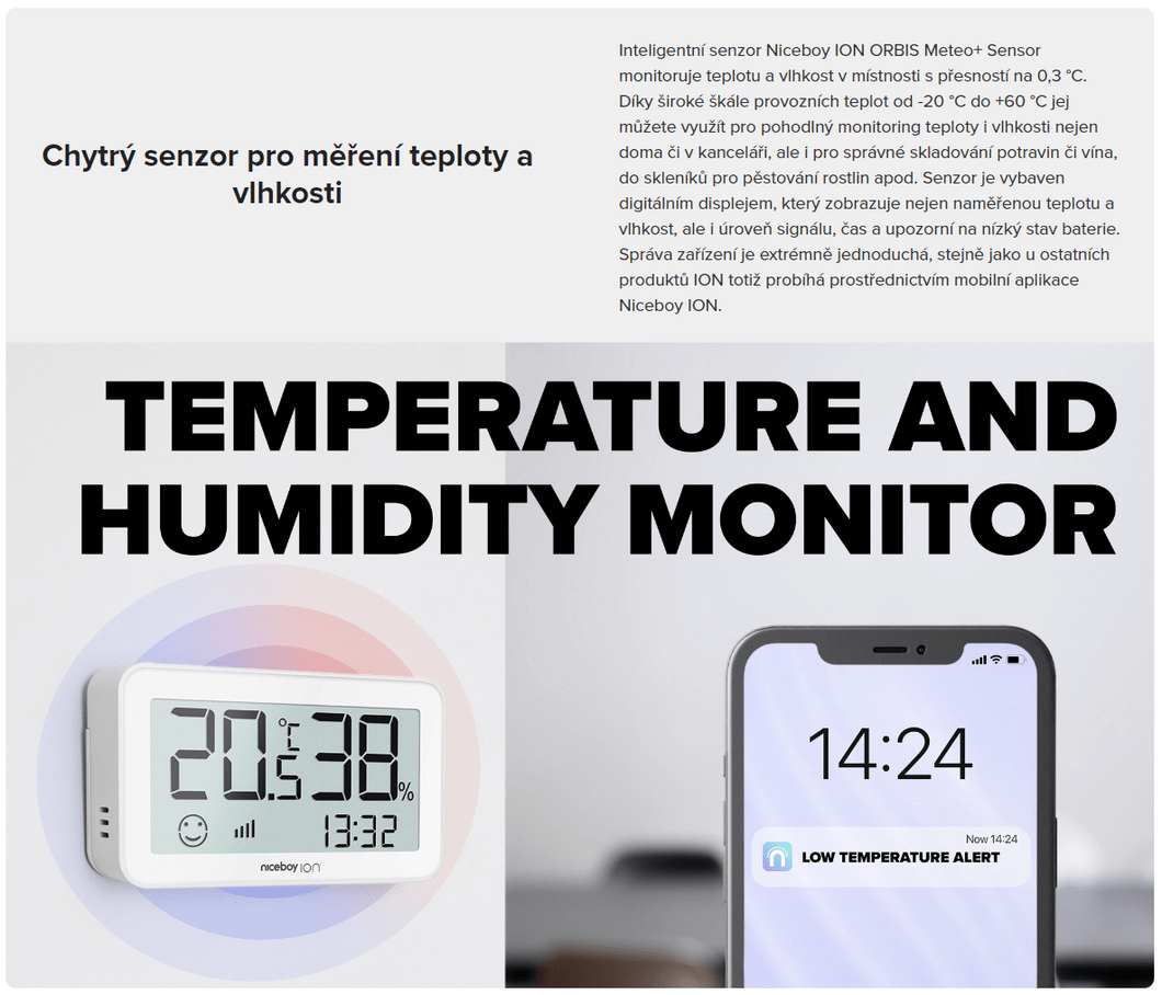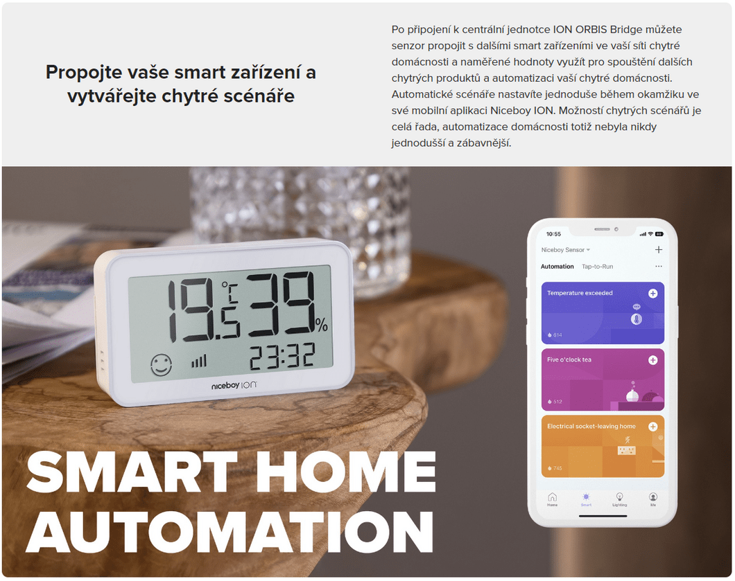 Temperatur und Luftfeuchtigkeit sind wichtige Werte für ein angenehmes Raumklima in Ihrem Zuhause. Mit dem Niceboy ION ORBIS Meteo+ können Sie sowohl die Temperatur als auch die Luftfeuchtigkeit über Ihr Mobiltelefon mit der Niceboy ION App kontrollieren. Darüber hinaus können Sie dank der Möglichkeit, sich mit anderen Produkten zu verbinden, die gemessenen Werte nutzen, um diese in intelligenten Szenarien automatisch ein- oder auszuschalten. Die Niceboy ION ORBIS Bridge Zentraleinheit ist erforderlich, um den Sensor zu verwenden.