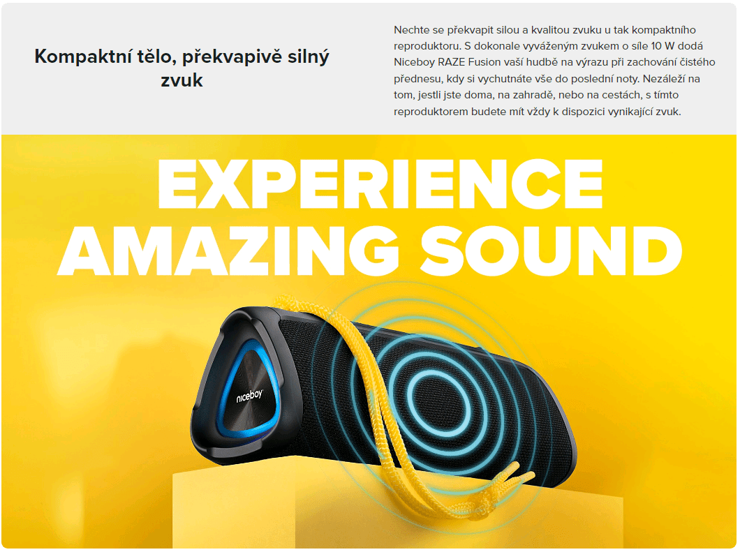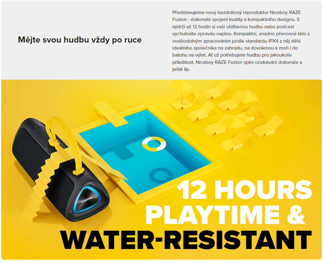 Haben Sie Ihre Musik immer griffbereit! Mit seinem ausgefeilten 10-W-Sound, dem wasserdichten Design und einer Akkulaufzeit von 12 Stunden ist der tragbare Lautsprecher Niceboy RAZE Fusion die perfekte Wahl für alle Musikliebhaber. Dazu kommen ein kompaktes Gehäuse und mehrere Wiedergabemodi, einschließlich FM-Radio, und Sie haben den perfekten Begleiter, wohin auch immer Sie Ihre Musik mitnehmen wollen.