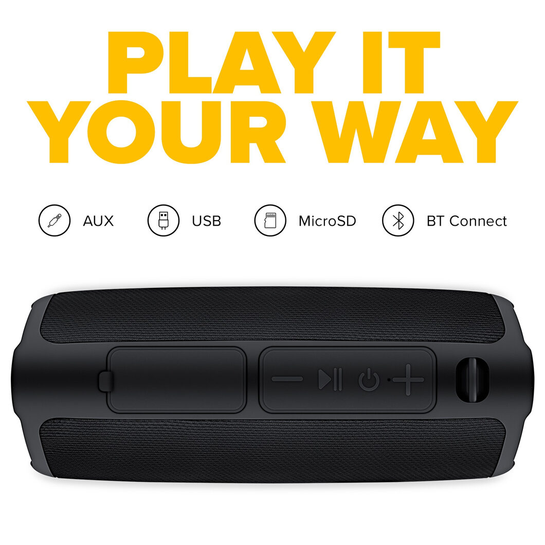 Der Lautsprecher ist IPX4-zertifiziert, sodass ihm schlechte Wetterbedingungen nichts ausmachen. | Dank des integrierten Mikrofons können Sie über den Lautsprecher telefonieren, ohne Ihr Telefon herausnehmen zu müssen. | Sie können den Lautsprecher ganz einfach über ein Kabel mit einem verlängerten USB-C-Anschluss aufladen. |