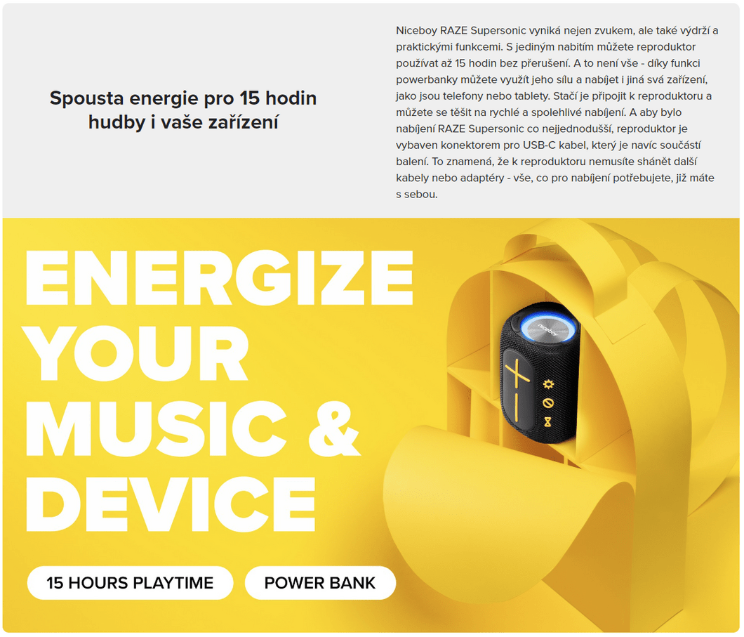 | Der Niceboy RAZE Supersonic kann unter anderem auch als Powerbank verwendet werden. Schließen Sie Ihr Gerät einfach über ein USB-Kabel an ihn an. | Geladen wird der Lautsprecher über ein Kabel mit verlängertem USB-C-Anschluss, das im Lieferumfang enthalten ist. | Dank des integrierten Mikrofons können Sie über den Lautsprecher telefonieren, ohne Ihr Telefon herausnehmen zu müssen. |