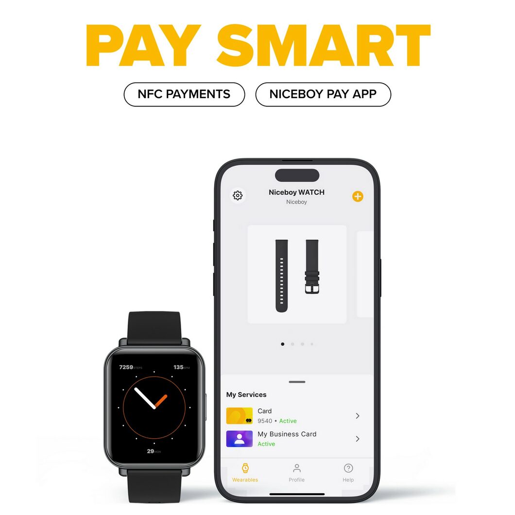 NFC-Zahlungen direkt am HandgelenkDas Bezahlarmband der Niceboy WATCH 4 mit integriertemNFC-Chip ermöglicht das kontaktlose Bezahlen direkt am Handgelenk, ohne dass Sie Ihre Brieftasche oder Ihr Handy mitnehmen müssen. Es funktioniert genau wie eine Kreditkarte. In derNiceboy PayApp stecken Sie Ihre Kreditkarte in das Armband und bezahlen dann einfach, indem Sie das Armband an das Terminal halten. Eine Liste der unterstützten Banken finden Sie hier:https://niceboy.eu/cs/info/niceboy-pay. |