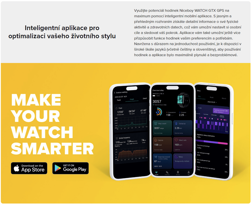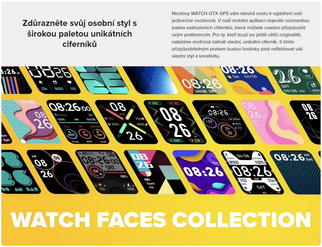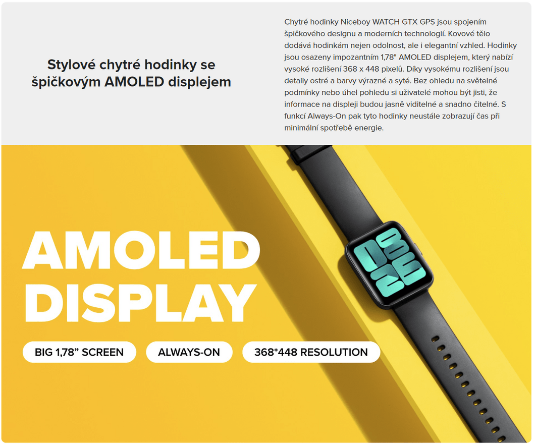 Die Bedienung der Uhr und der App ist einfach, denn Sie können neben Englisch auch weitere Sprachen (einschließlich Tschechisch oder Slowakisch) einstellen. | Dank dieser Funktion zeigt das Display der Smartwatch ständig die Uhrzeit an, und das bei minimalem Batterieverbrauch. | Bei der Niceboy WATCH GTX GPS können Sie das Armband dank der 22 mm breiten Schnellverschlussschließe einfach wechseln. |