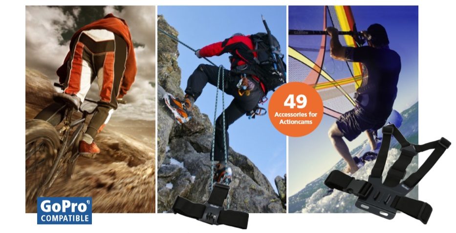 Rolleis vielseitiges 49-teiliges Zubehör-Kit für Actioncam- und GoPro-Kameras, das für Outdoor-Aktivitäten entwickelt wurde.