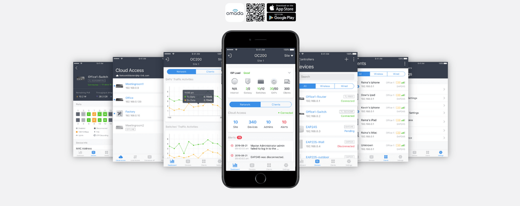 Folgen Sie den Einrichtungsanweisungen in der kostenlosen Omada-App, um den gesamten Prozess in wenigen Minuten abzuschließen. Mit der Omada-App können Sie Einstellungen ändern, den Netzwerkstatus überwachen und Clients verwalten - alles bequem von Ihrem Smartphone oder Tablet aus.