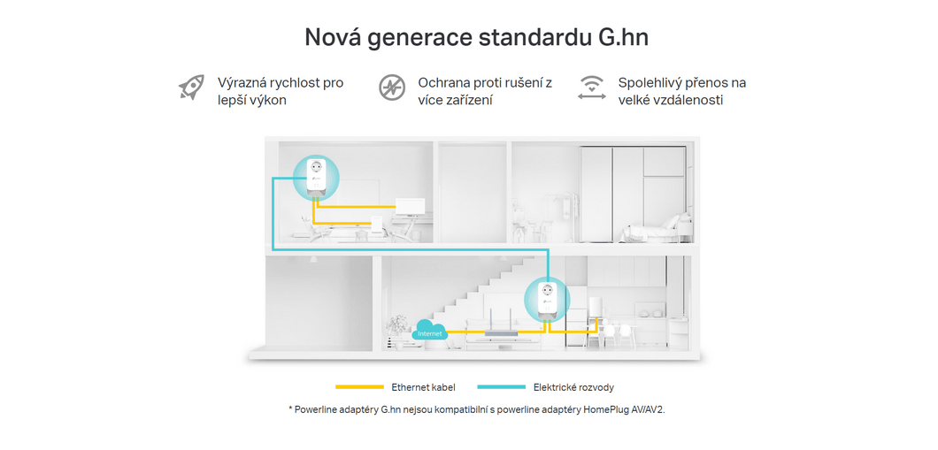 MaximalePowerline-Signalgeschwindigkeiten sind physikalische Geschwindigkeiten, die von den G.hn-Spezifikationen abgeleitet sind. Der tatsächliche Powerline-Datendurchsatz und die Powerline-Reichweite werden nicht garantiert und variieren aufgrund von Netzwerkbedingungen und Umgebungsfaktoren, einschließlich elektrischer Interferenzen, Verkehrsaufkommen und Netzwerk-Overhead, AFCI-Unterbrecher und Powerline-Standort auf einem separaten Stromkreis.