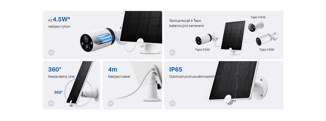 - Nonstop-Solarstrom - fängt kostenlose, saubere Sonnenenergieein und liefert kontinuierlich Strom für Tapo batteriebetriebene Kameras (Tapo C425, Tapo C420 und Tapo C400), um Sie das ganze Jahr über zu schützen.