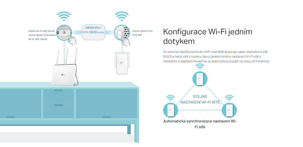 - Automatische Wi-Fi-Synchronisierung - kopieren Sie einfach die Wi-Fi-Einstellungen Ihres Routers und übernehmen Sie alle Änderungen in Ihrem gesamten sicheren Powerline-Netzwerk mit den Funktionen zum Klonen und Verschieben von Wi-Fi.