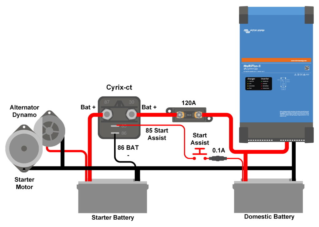 Der Cyrix kann auch über einen Druckknopf (der Cyrix bleibt 30 Sekunden lang eingesteckt) oder einen Schalter angeschlossen werden, um die Batterien manuell zu verbinden (Parallelschaltung). Dies ist besonders nützlich im Notfall, wenn die Starterbatterie leer oder beschädigt ist.
