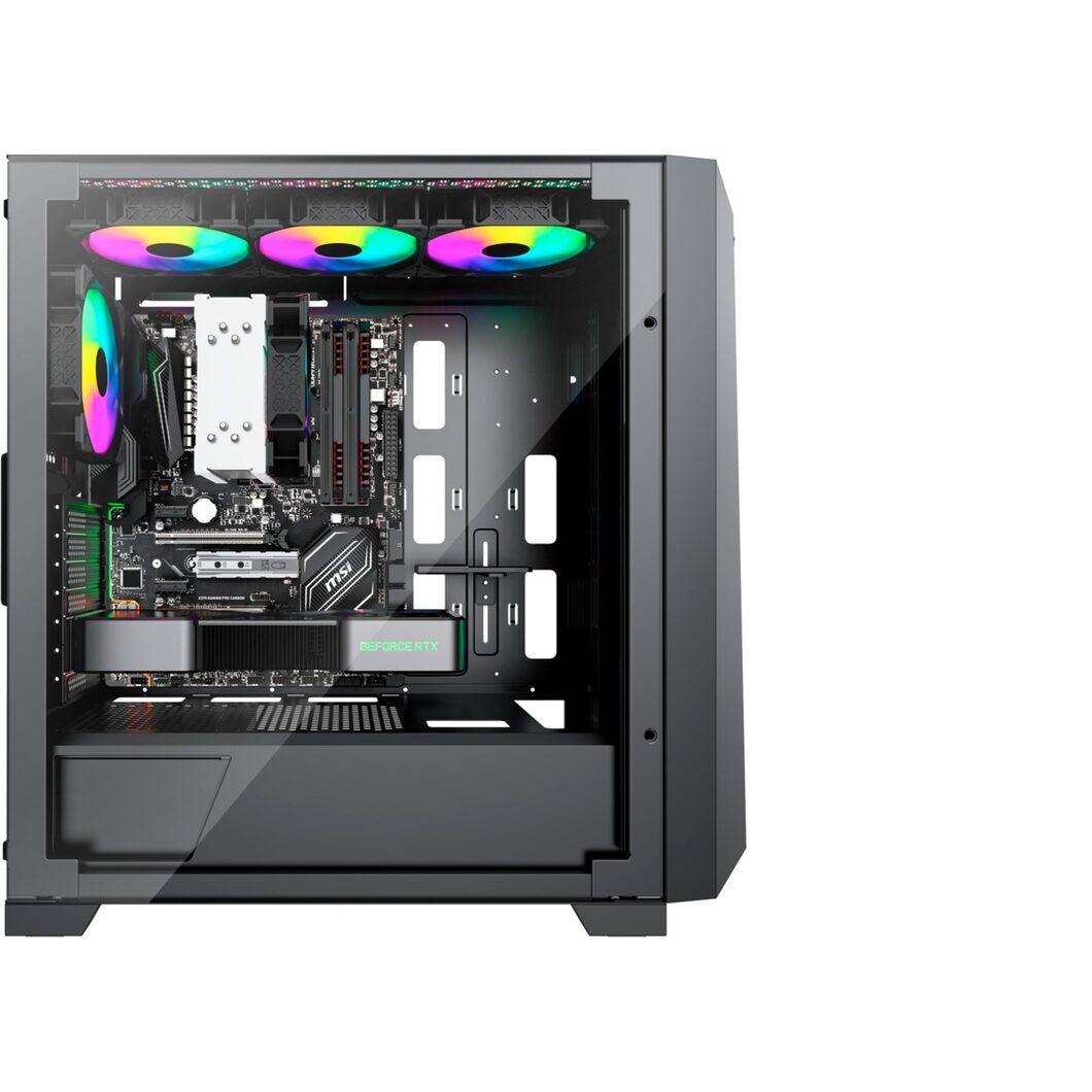 - 3× vorinstallierter ARGB-Lüfter (120 mm) in der Front + 1× hinterer 120 mm-Lüfter.